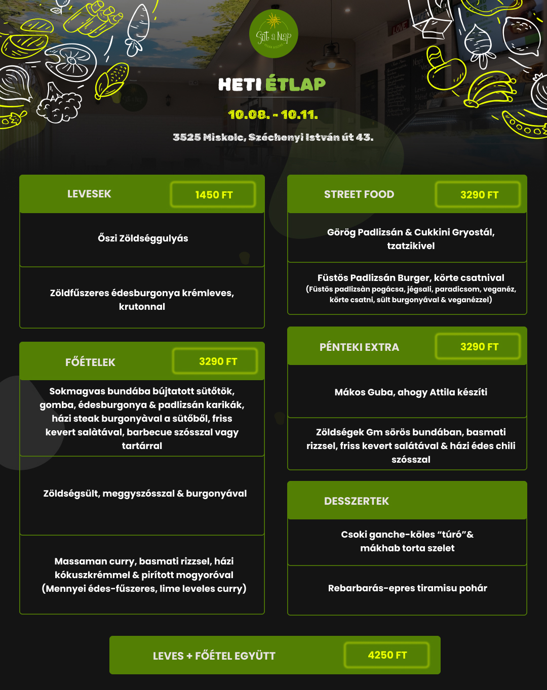 A minden nap megújuló, mentes és vegán menü ajánlatunk mellett, válogathatsz az étlapunkról is.